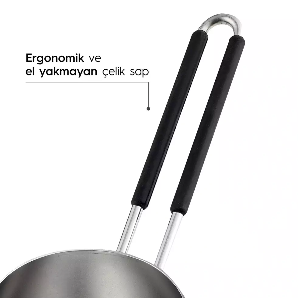 - Ergonomik ve El Yakmayan Çelik Sap: Cezvenin ergonomik sapı, kullanım sırasında rahat bir tutuş sağlar ve sıcaklık nedeniyle elinizi yakmaz.