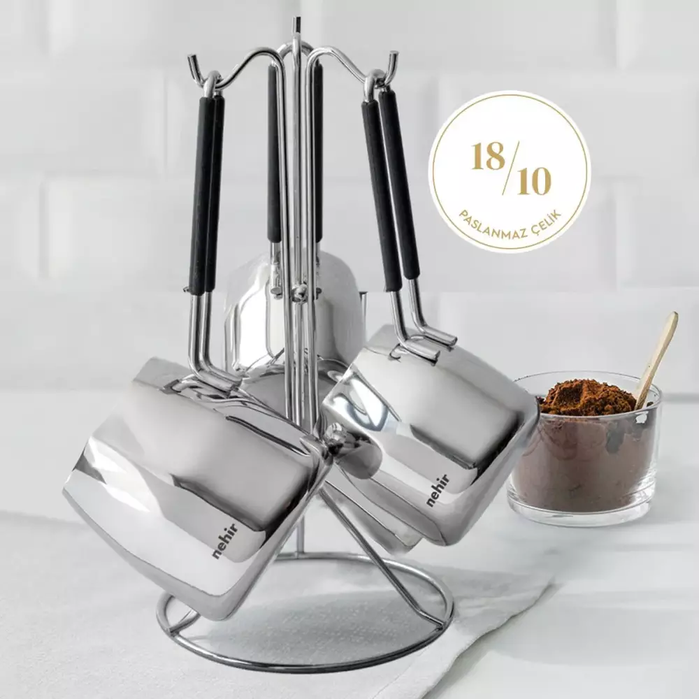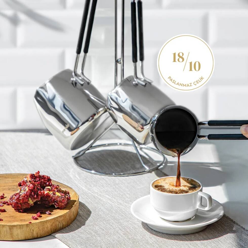 - Parlak Polisajlanmış Yüzey: Modern 4 Parça Standlı Paslanmaz Çelik Cezve Seti, özenle polisajlanmış parlak yüzeyiyle şık ve estetik bir görünüm sunar.